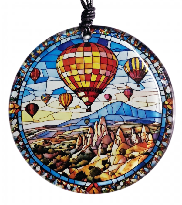 Kapadokya’nın büyüleyici atmosferini cam sanatıyla buluşturan özel tasarım! Kapadokya ve sıcak hava balonları baskılı vitray görünümlü füzyon cam, renkli detaylarıyla evinize veya iş yerinize sanatsal bir dokunuş katıyor.
